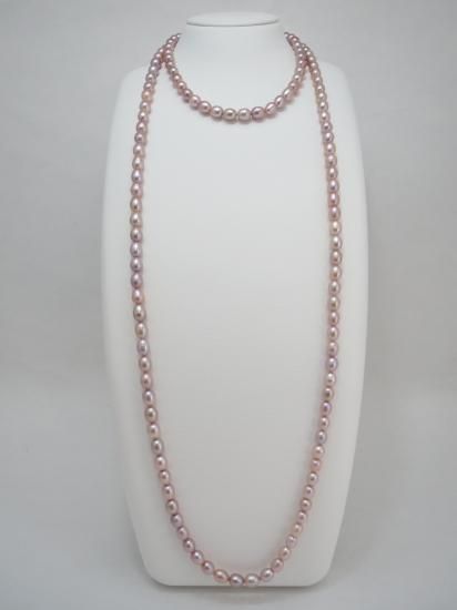 【種類】淡水真珠 【形】オーバル 【サイズ】約6.5-7.0mm 【色】ピンクパープル 【メタル】SILVER 【長さ】約120cm 【テリ】A 【キズ】A ※色味指定不可
