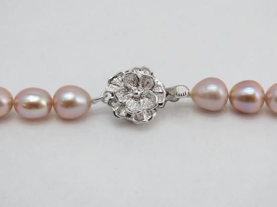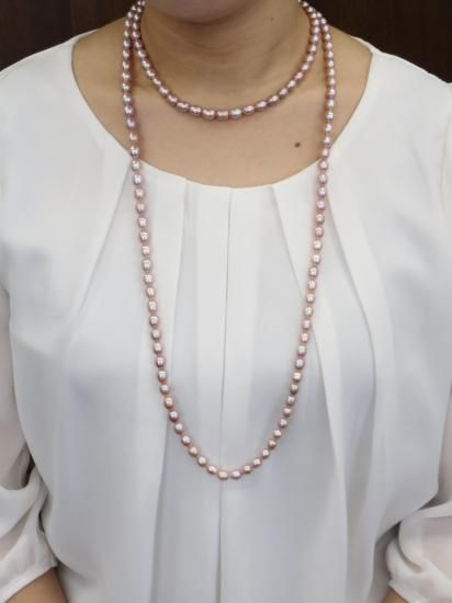 柔らかく印象を与えるピンク系オーバルパールを使用したロングネックレス